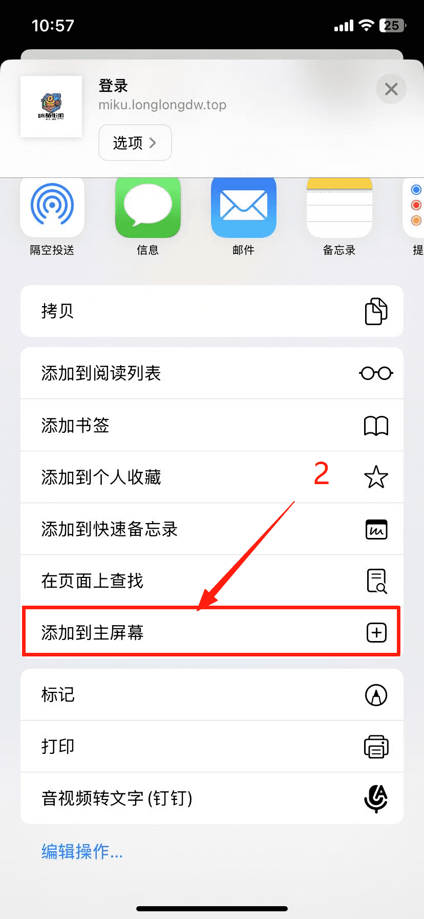 2向上滑动,点击【添加到主屏幕】